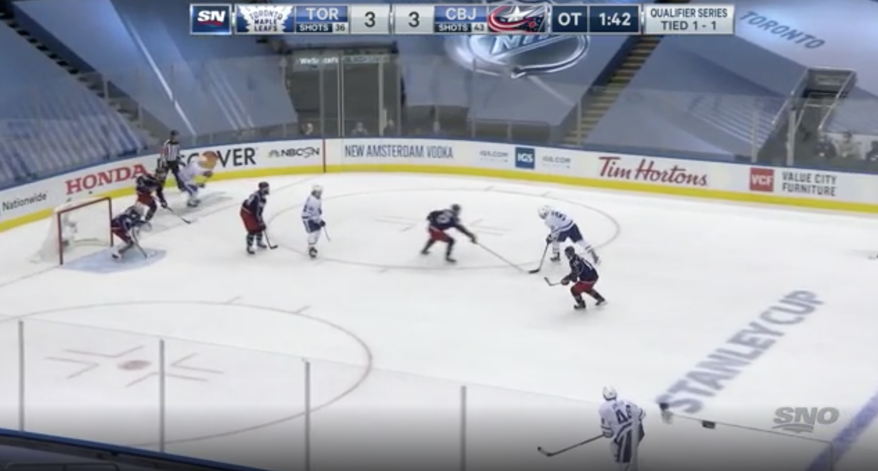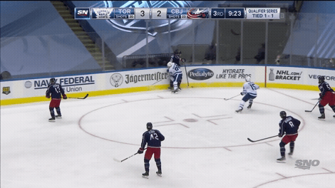 1. Toronto’s showing seems best defined through the play that happened just inside Columbus’ blue line before the tying goal. On that play Pierre-Luc Dubois took the puck down the ice from his own end, stayed just a step ahead of Kasperi Kapanen, and beat Frederik Andersen to tie the game. What happened there?