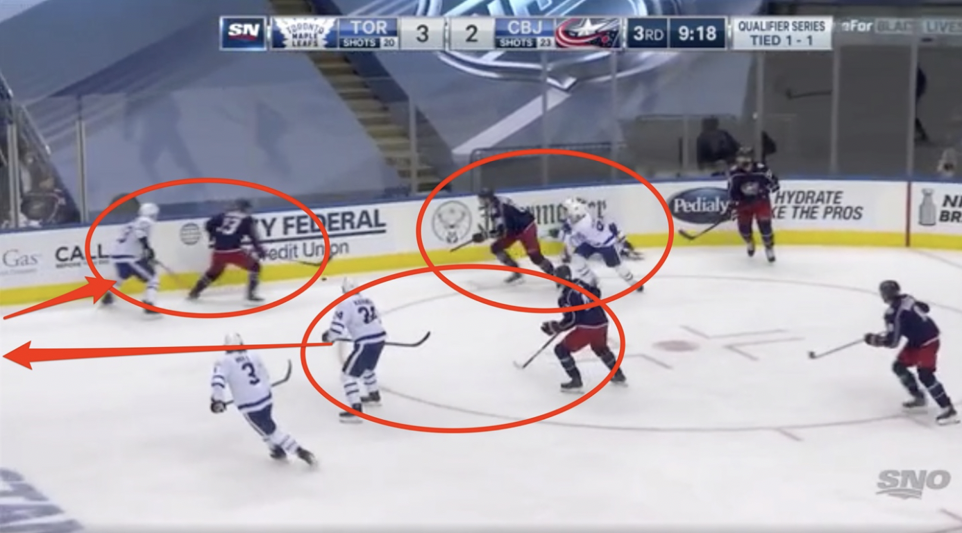 The problem, of course, is that when Dermott comes down, Kapanen is supposed to fill-in behind him, which he’s on his way to doing. It doesn’t happen super-fast, though, in part because I think he sees the Columbus forward that’s farthest up the ice (and so, the biggest threat) as Texier, who he’s already above, and that Dubois comes out of that low pile with zero resistance after a weak battle where neither Leafs forward is on the defensive side.
