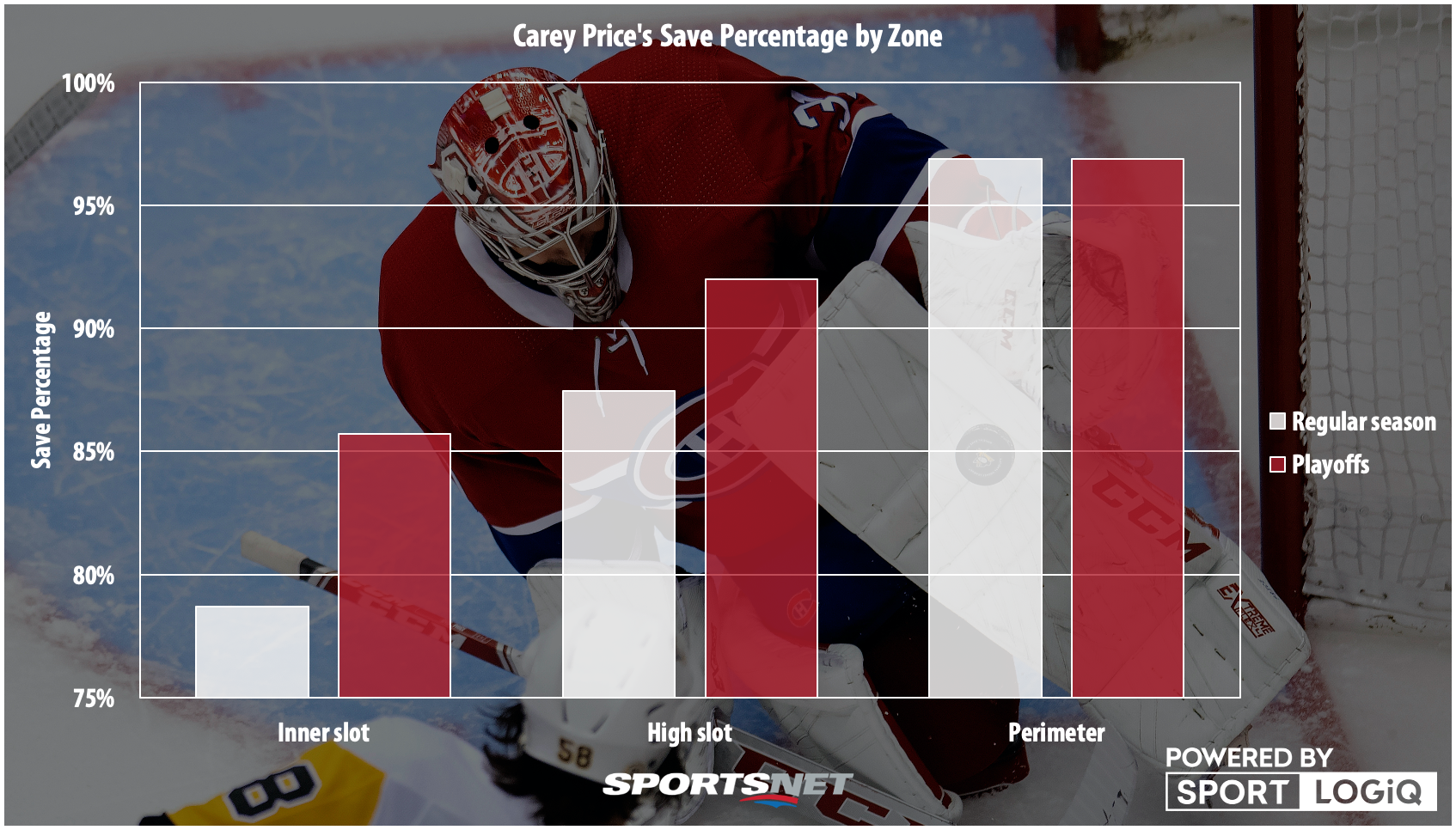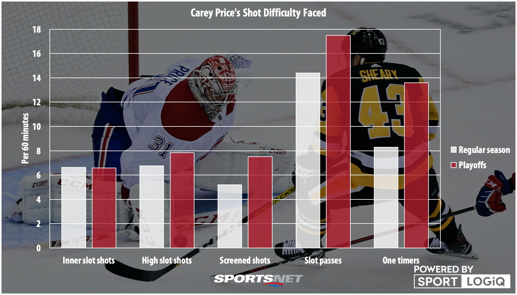 Fast forward to three games into the five-game series, and Price has been the MVP so far with his Canadiens holding a 2-1 series lead on the back of his .937 save percentage. Compared to the regular season, Price has been far, far better from both the inner slot and the high slot, and he hasn’t given the Penguins an easy goal yet three games into a series that — on paper — shouldn’t be where it is.