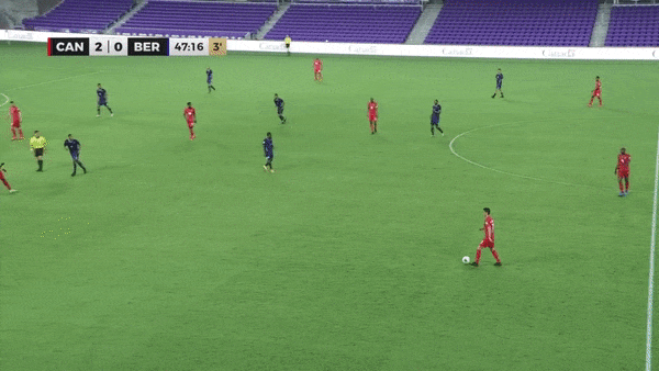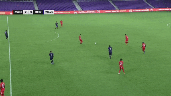 Against Bermuda (left, above), three defenders sat back, the midfield partnership of Stephen Eustaquio (No. 7) and Atiba Hutchinson (No. 13) formed a block of four with Alphonso Davies (No. 19) along with Richie Laryea (No. 22). Then the three forwards had freedom to roam, as did Davies and Laryea.