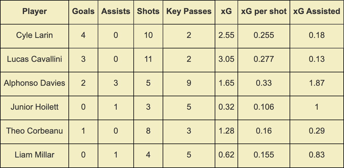 Cyle Larin was the beneficiary of those three Davies assists against Bermuda before following that up with a goal against the Cayman Islands. Having started as an inside forward with freedom to roam before being deployed as a No. 9 in the latter match. In fact, he wasn't the only Canadian attacker to produce tremendous expected goals and other underlying numbers in these games.