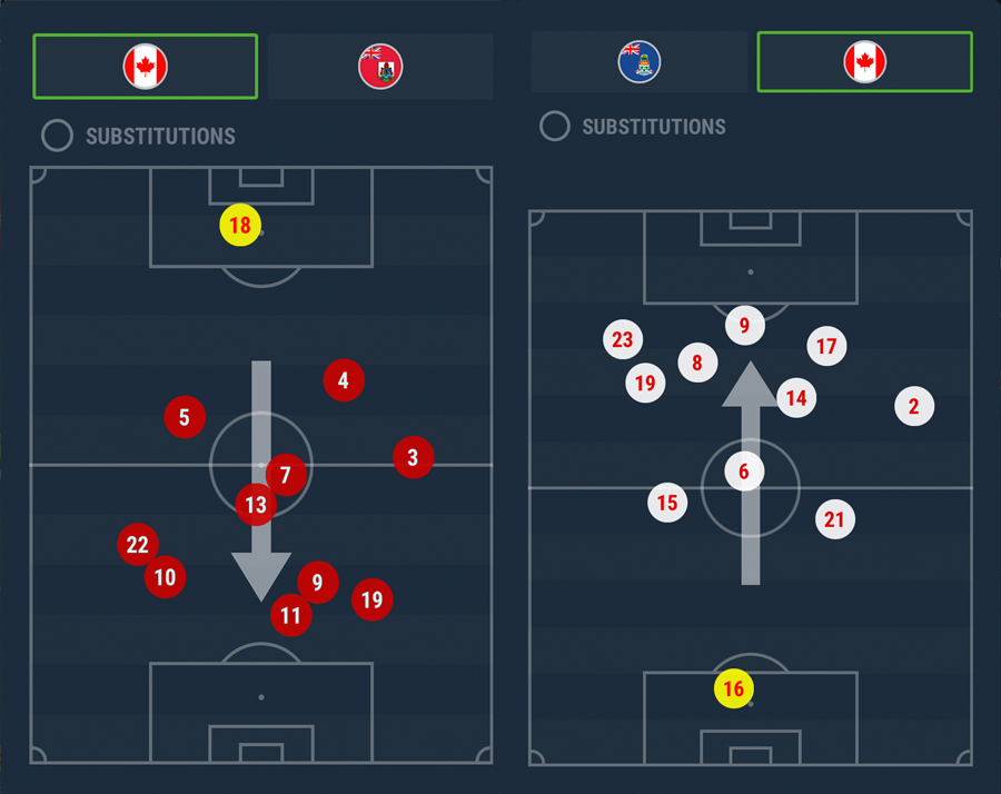"We started with a 4-3-3 and then that evolves with the movement and exchanges on that side of the field," said Herdman. "We knew [Cayman Islands] were going to park the bus with a 5-4-1 and that opportunity to keep penetrating that inside channel was something we targeted. Those runs from behind, two behind, to break the deep block."
